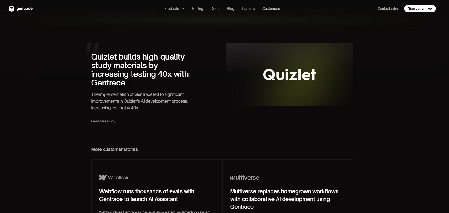 This section immediately establishes credibility through prominent case studies, featuring how major companies like Quizlet and Webflow have achieved measurable results. The Quizlet headline—"Quizlet builds high-quality study materials by increasing testing 40x with Gentrace"—succinctly communicates both the use case and the quantifiable outcome.