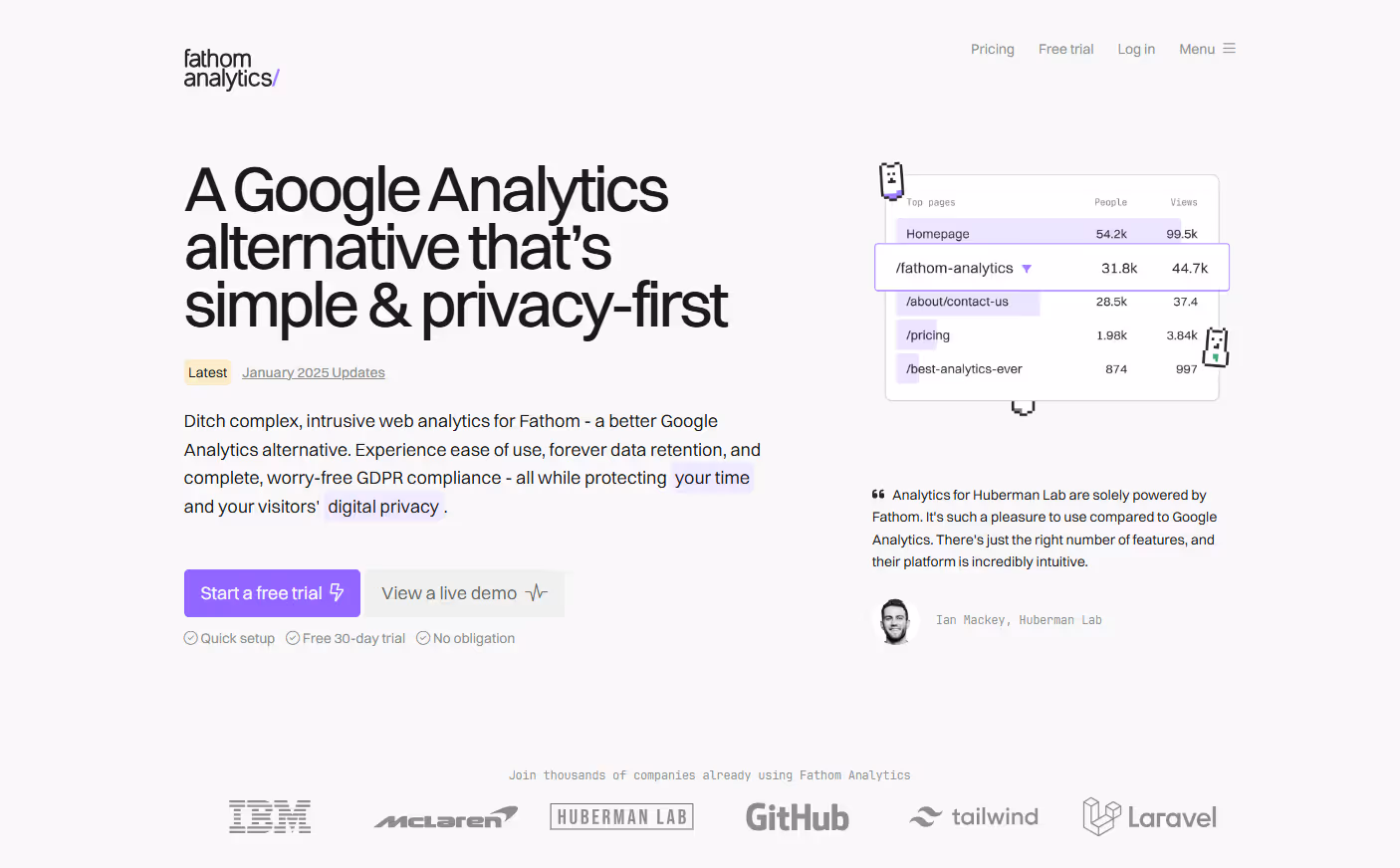 A classic example of that approach is Fathom Analytics, who had the guts to challenge a mammoth - Google Analytics. They decided to be bold enough to state in their core message that they are GA's alternative, spotlighting two main benefits that are the direct opposites of GA's cons:
