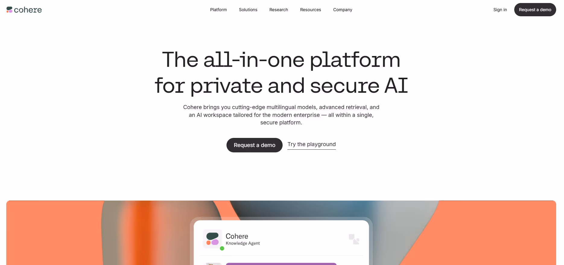 Cohere.com positions itself with a clear value proposition: "The all-in-one platform for private and secure AI." This headline immediately addresses two critical concerns for enterprise AI adoption—integration complexity and security.