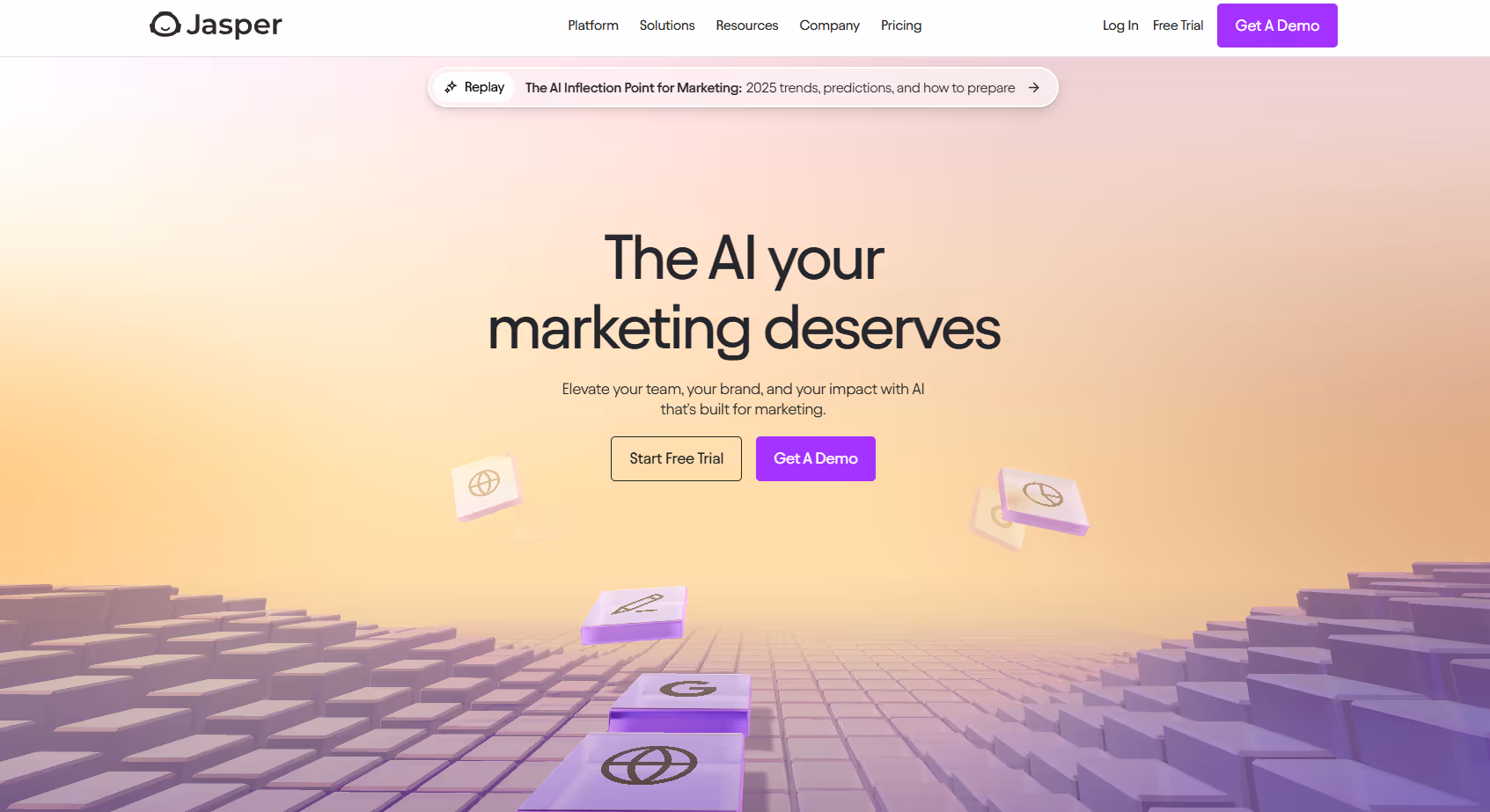 Jasper.ai captures visitor attention with their compelling headline: "The AI your marketing deserves." This customer-focused messaging addresses marketers directly, positioning their tool as a solution specifically tailored to marketing needs.