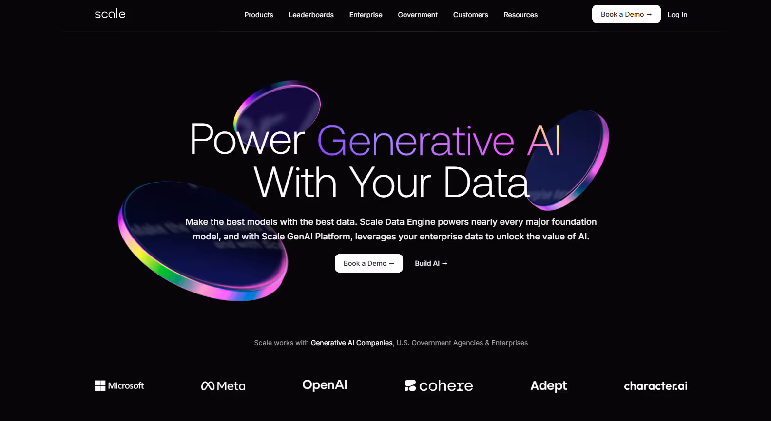 Scale.com commands attention with their visually striking interface and compelling headline: "Power Generative AI With Your Data." This messaging highlights their unique value proposition—leveraging existing enterprise data rather than generic AI models.