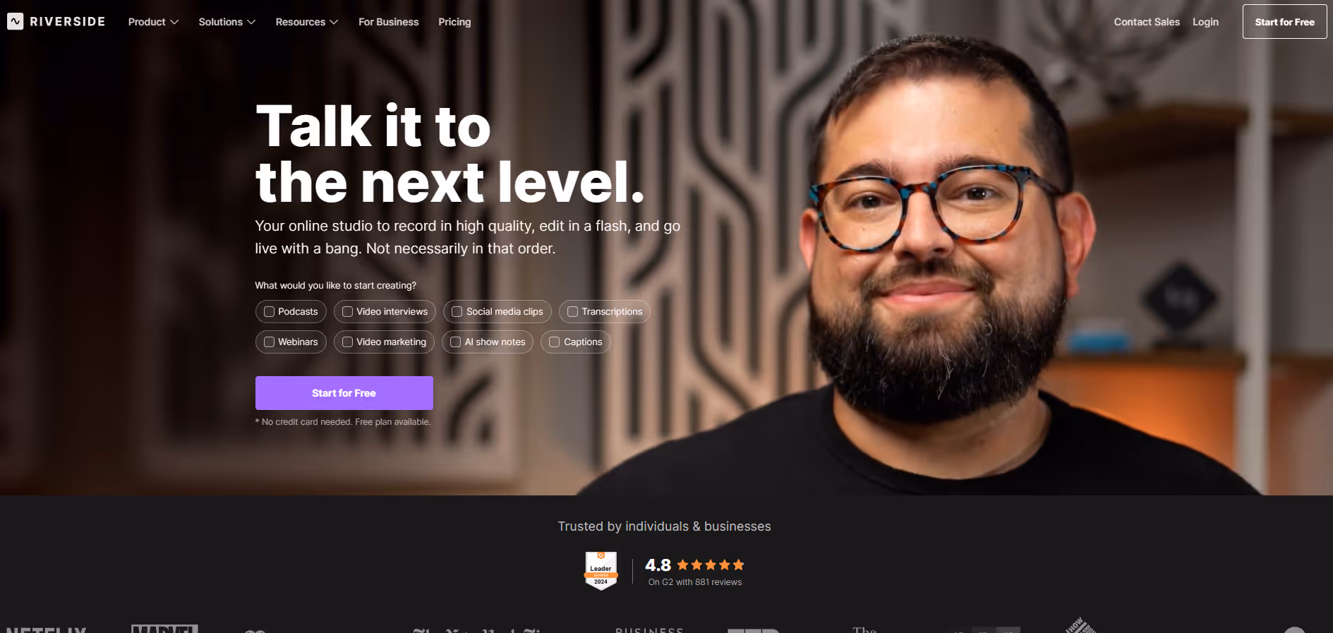 Riverside.fm captures attention with a confident headline: "Talk it to the next level." This aspirational messaging immediately positions them as an upgrade from basic recording tools, appealing to content creators looking to enhance their production quality.