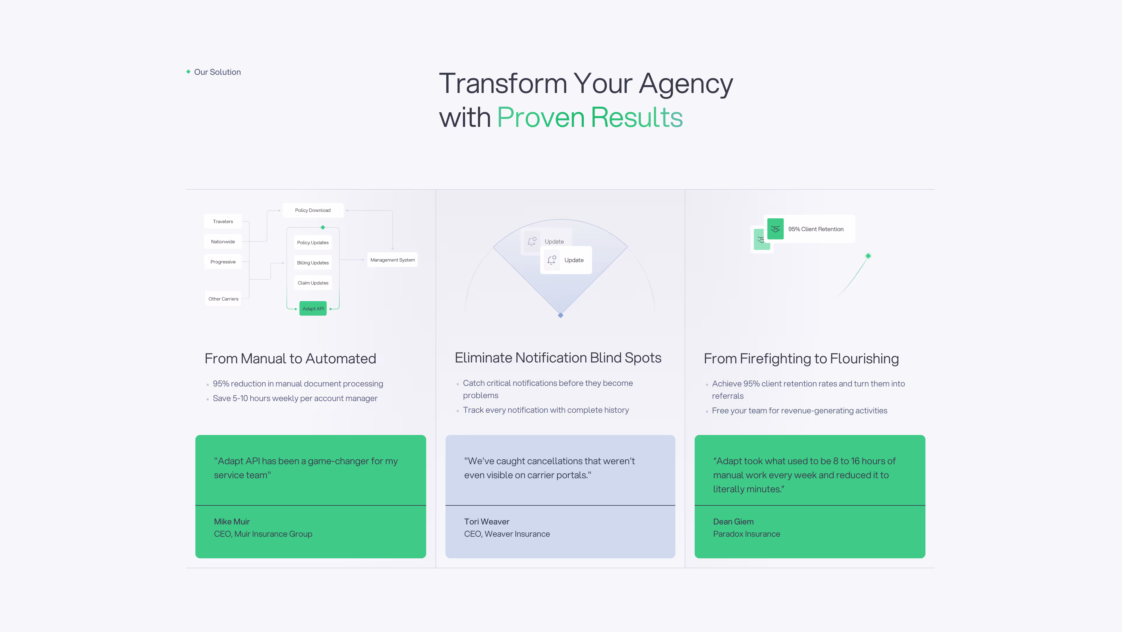 Through careful information architecture and thoughtfully animated diagrams, we created a website that not only looks clean and structured but also helps visitors understand Adapt's sophisticated automation capabilities at a glance.