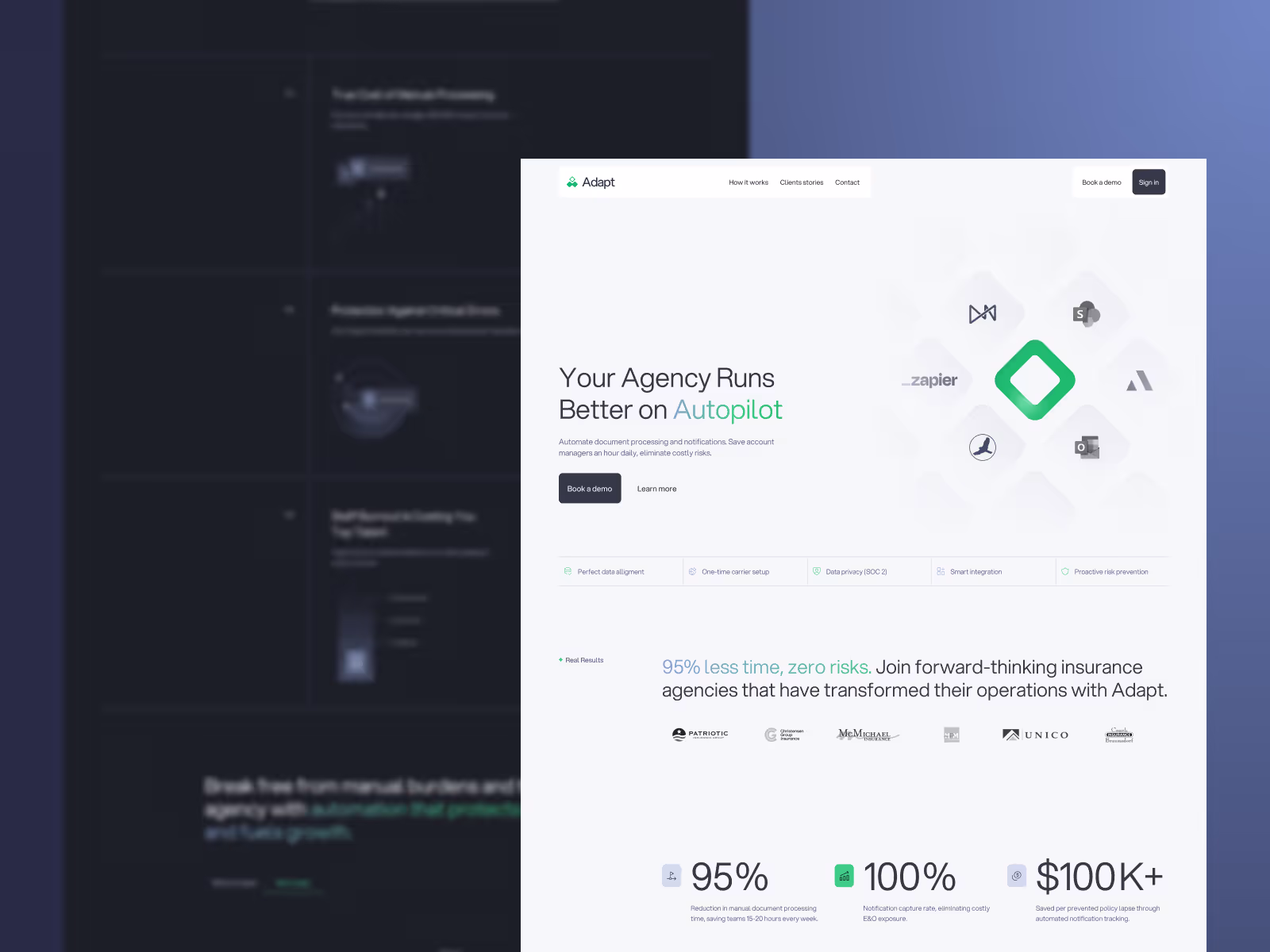 For Adapt API, we crafted their messaging, rebranding, and built a website that showcases how their platform transforms complex insurance workflows into automated processes. The site clearly communicates the key benefit: saving agencies 15-20 hours weekly while reducing policy lapse risks. This new foundation supports their marketing efforts and lead generation strategy.