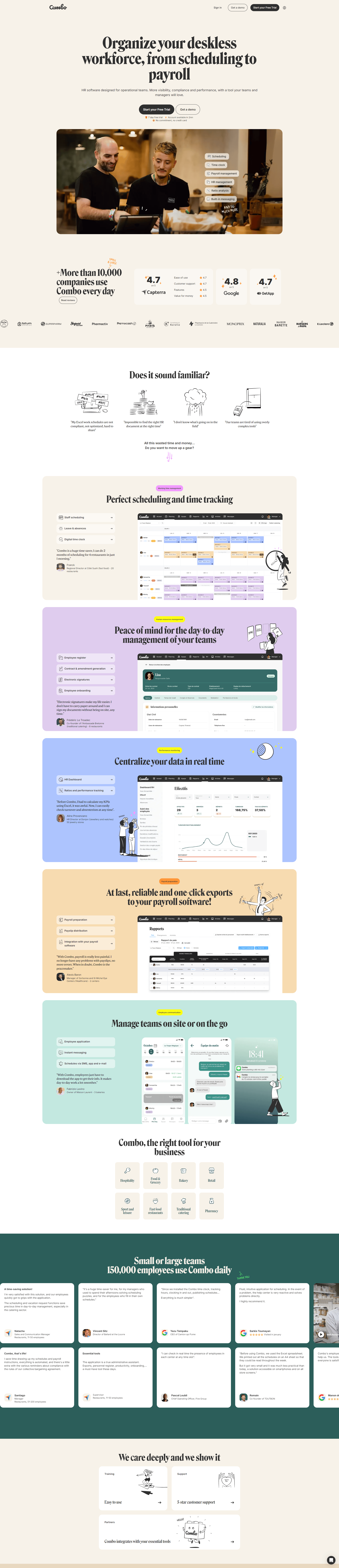 Combo optimizes staff scheduling and HR tasks, simplifying daily business operations for over 10,000 companies.