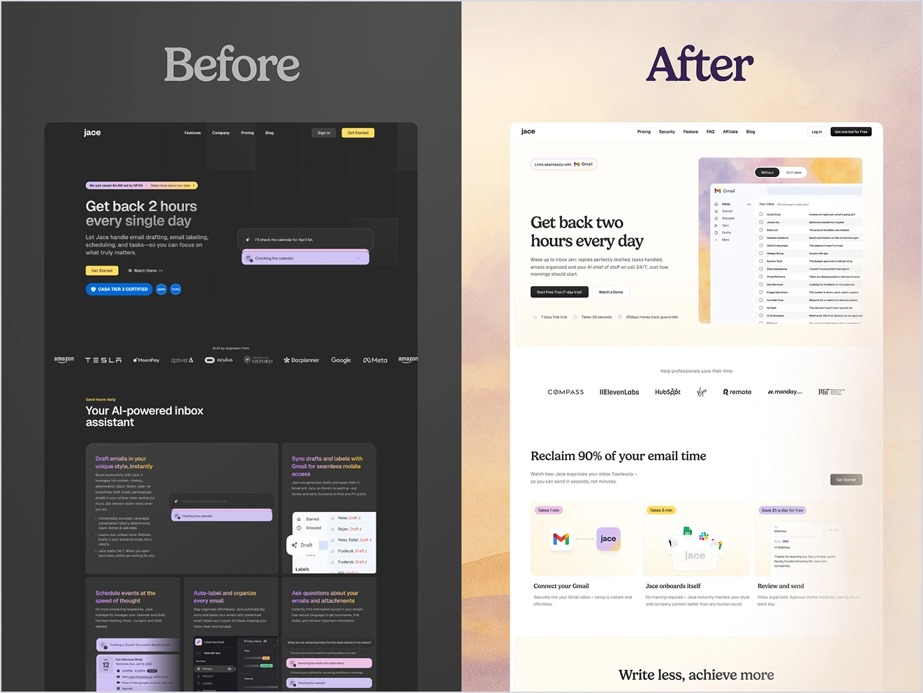 Jace.ai had powerful AI email technology but users couldn't understand its value or trust the product. We transformed their digital presence with new branding and marketing designs that made complex features instantly clear.